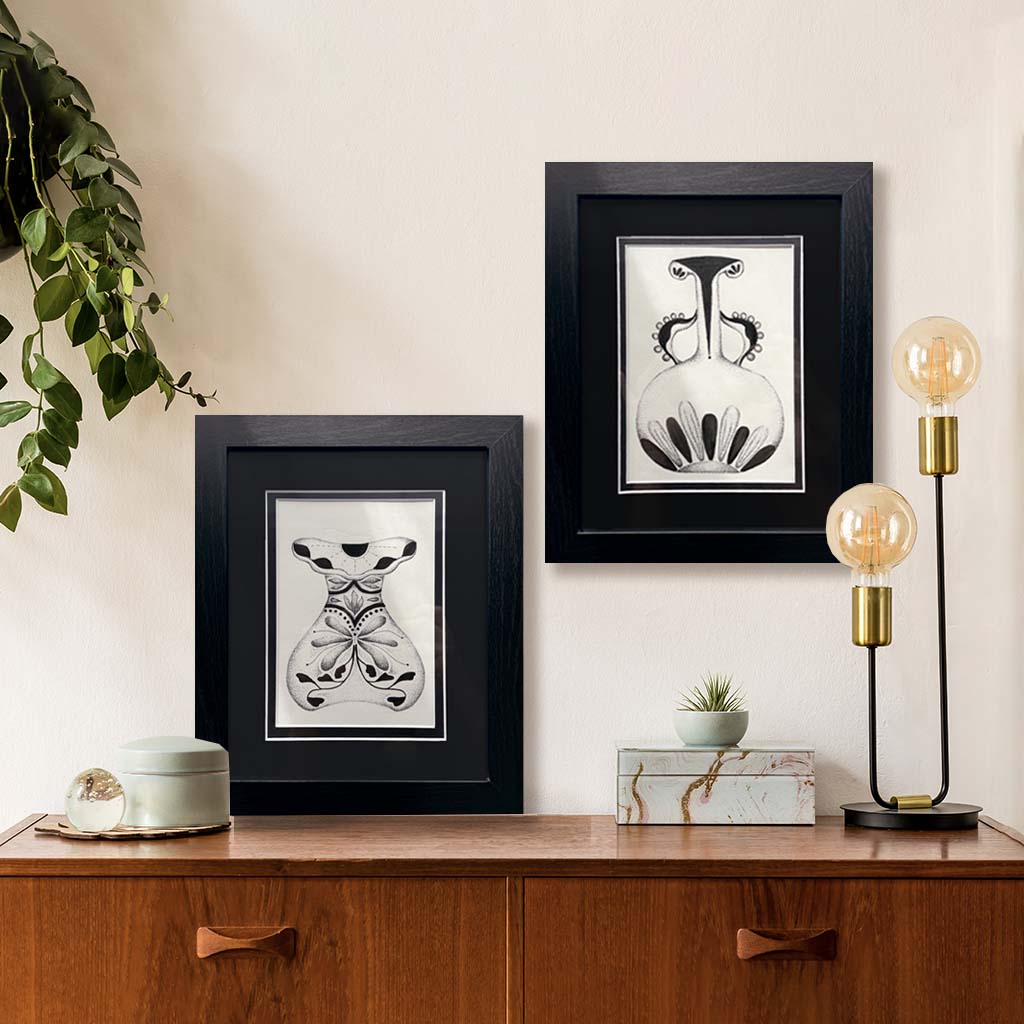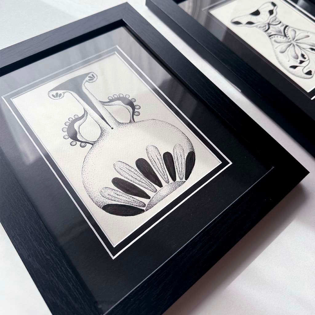 Hand-drawn with Chinese ink markers and pens, the collection blends organic shapes, ornamental details, and soft stippling to create modern relics that feel both mystical and timeless. Each piece is framed and ready to display, offering a small moment of reflection and artistry for any space.