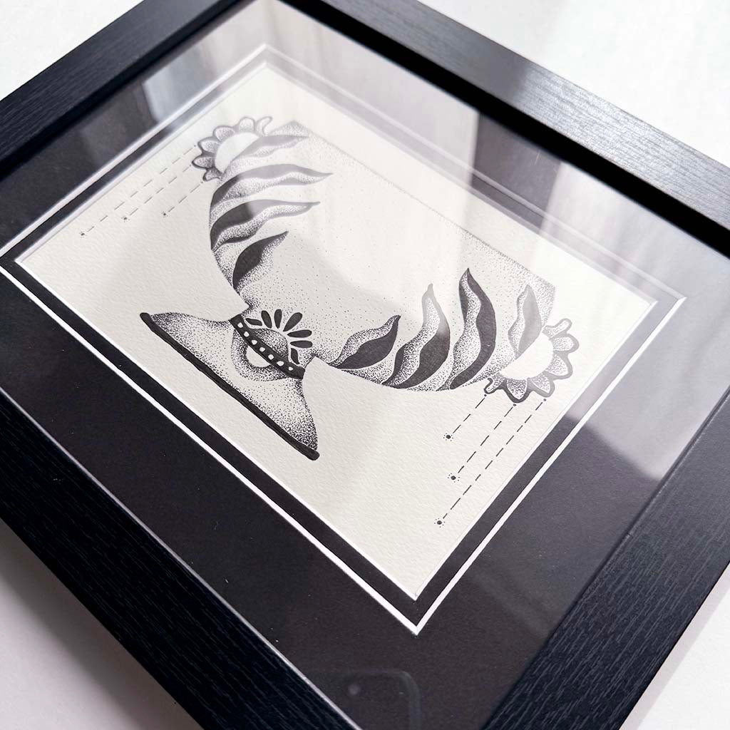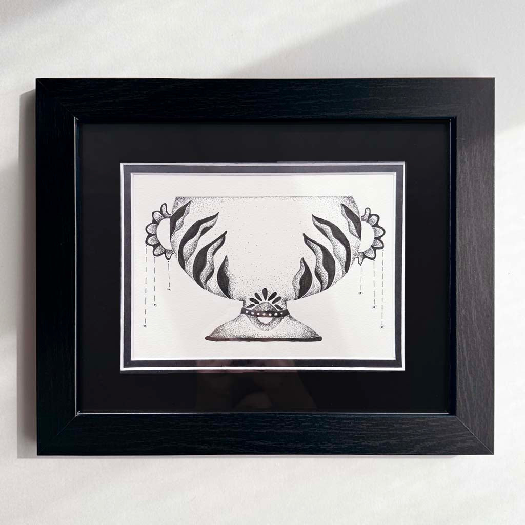 Hand-drawn with Chinese ink markers and pens, the collection blends organic shapes, ornamental details, and soft stippling to create modern relics that feel both mystical and timeless. Each piece is framed and ready to display, offering a small moment of reflection and artistry for any space.