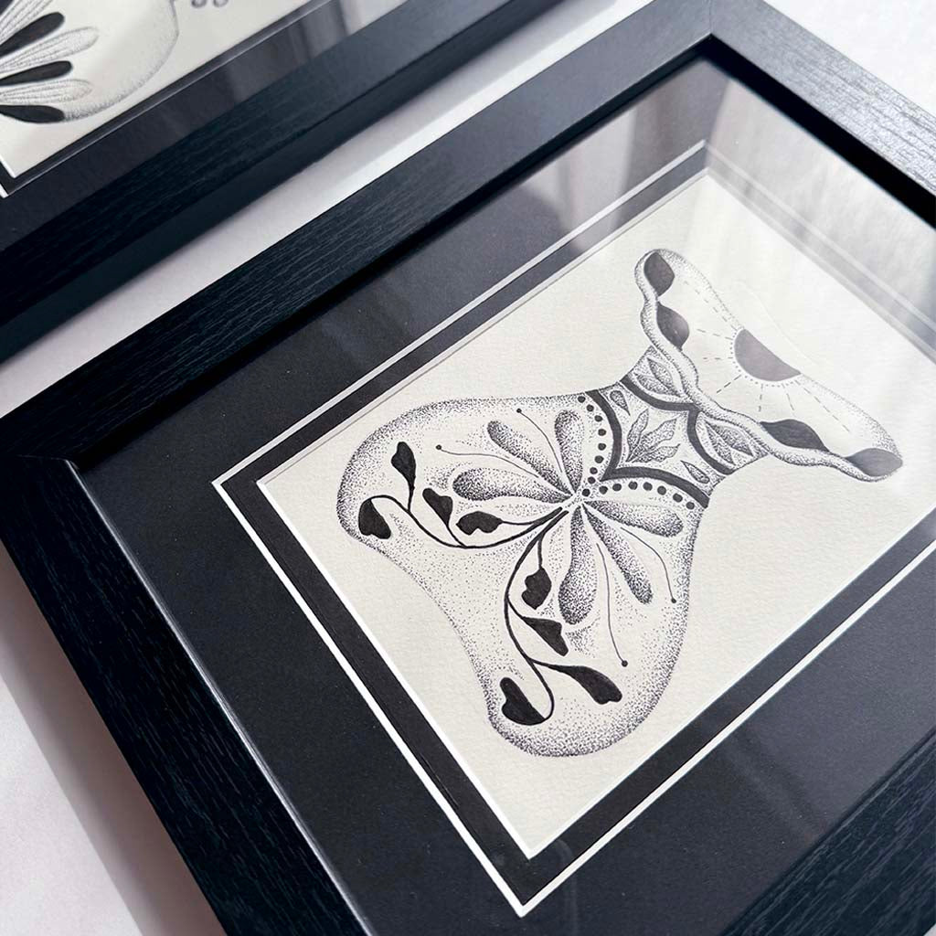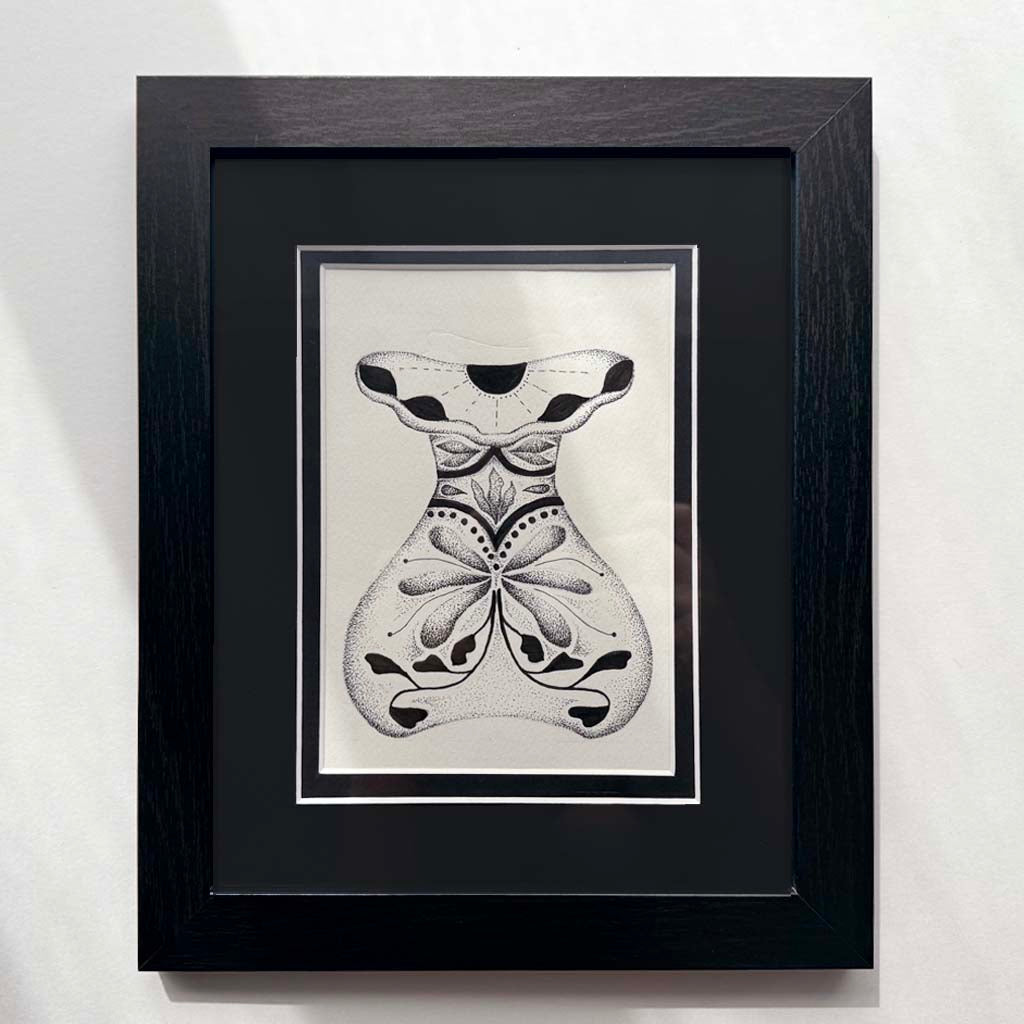 Hand-drawn with Chinese ink markers and pens, the collection blends organic shapes, ornamental details, and soft stippling to create modern relics that feel both mystical and timeless. Each piece is framed and ready to display, offering a small moment of reflection and artistry for any space.