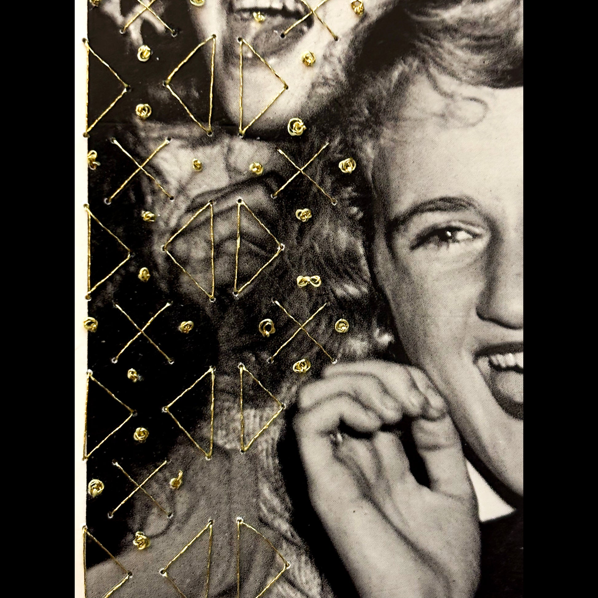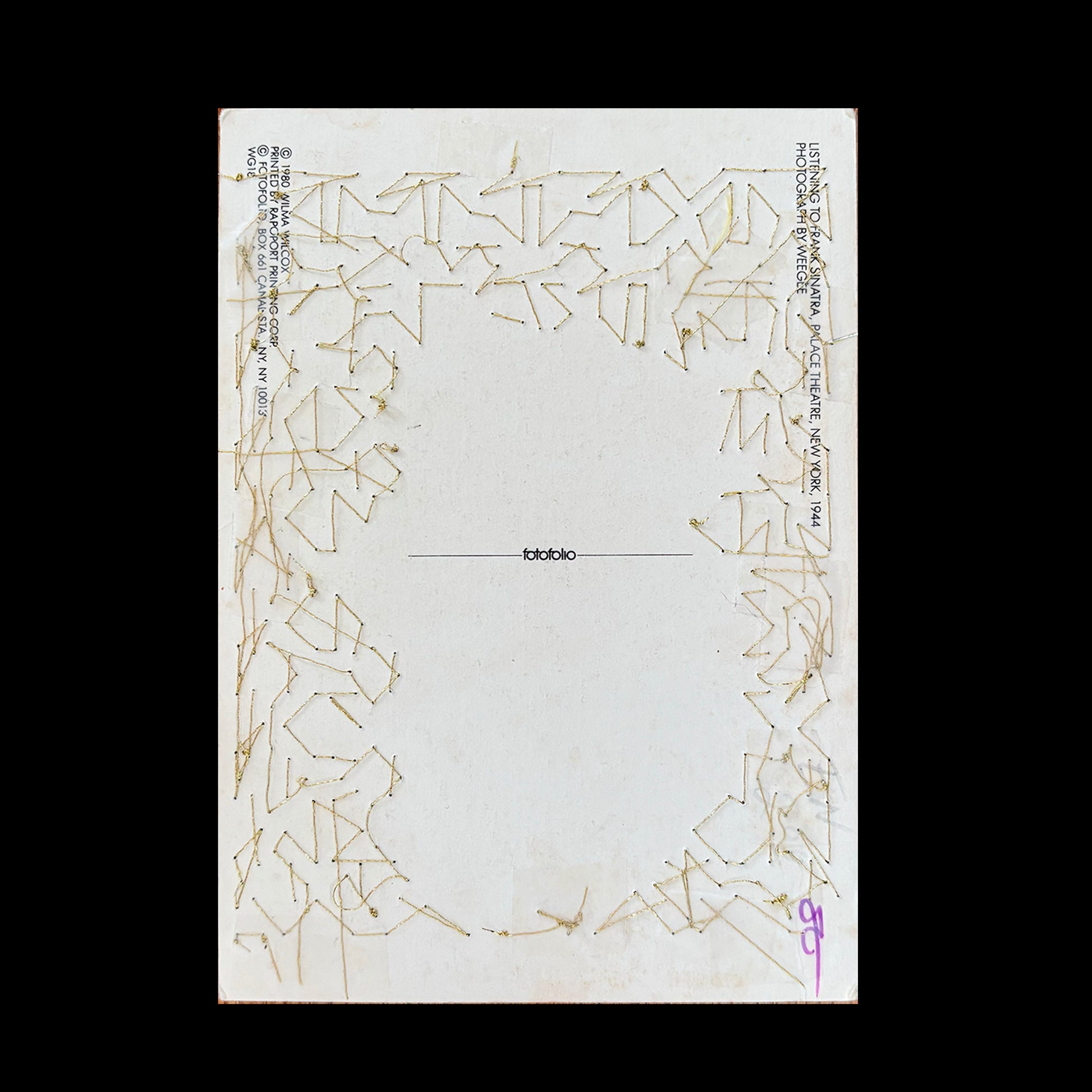 Postcard featuring Listening to Frank Sinatra, Palace Theatre, New York, 1944, photograph by Weegee. The background is adorned with a delicate geometric pattern rendered in fine gold thread.